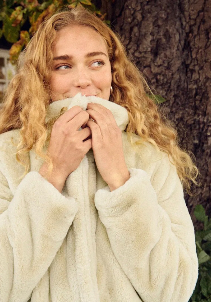 The Loes coat brings warmth and understated luxury to cold-weather dressing. Crafted in plush faux fur in a soft plaza taupe shade, it features a stand-up collar, neat press-stud fastening through the front, and practical patch pocket detailing. Fully lined for comfort and easy layering, this coat offers a chic yet cosy finish to both everyday outfits and evening looks.